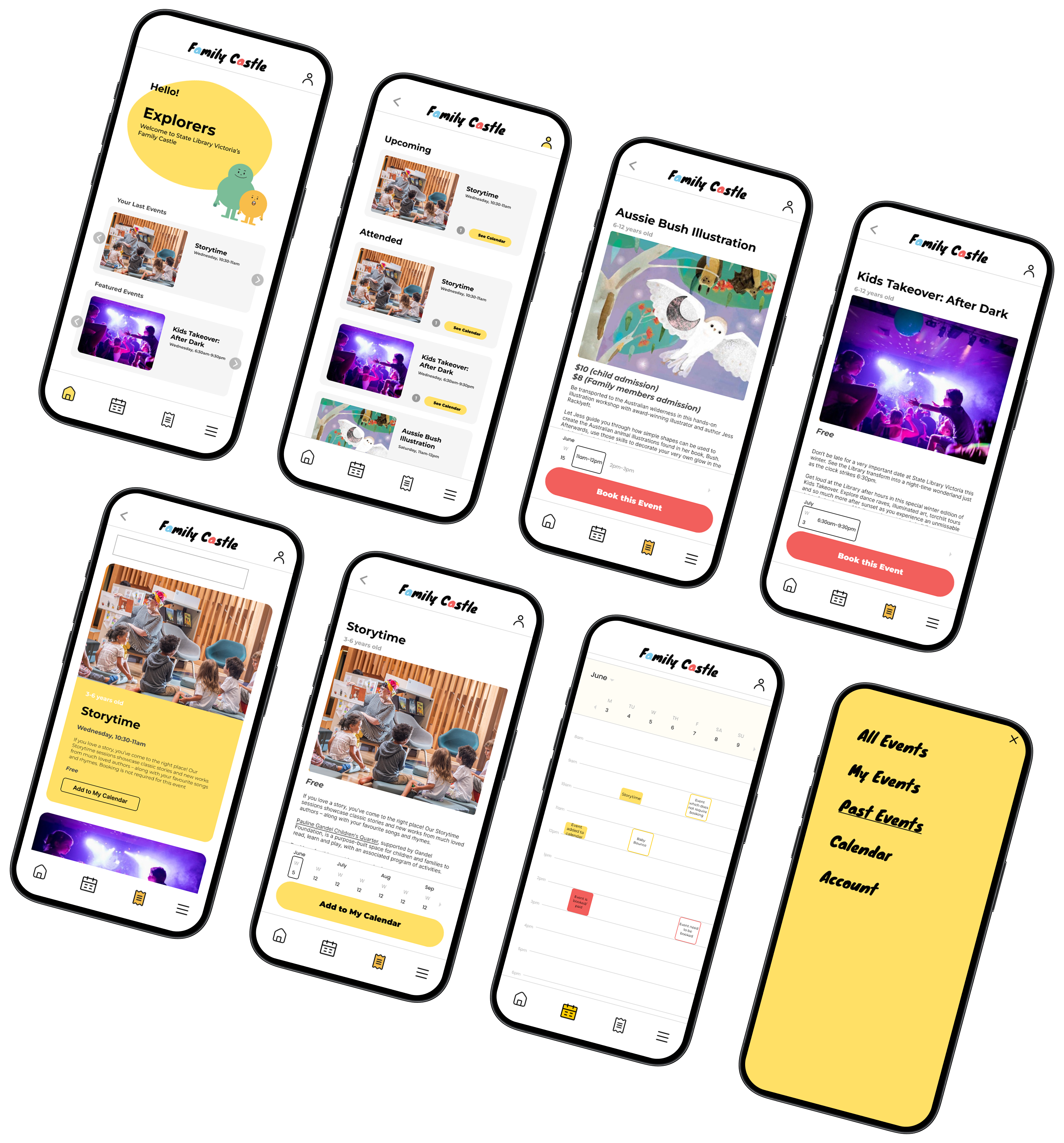 Parents found it difficult to discover and book children’s events at the State Library due to a hidden entry point and complex web-based process. I redesigned the experience by remapping the booking journey and creating a dedicated mobile app that centralises event information and simplifies rejoining recurring sessions. The new design made event discovery intuitive and reduced the steps needed to complete a booking, supporting busy parents in engaging with the library’s programs more easily.